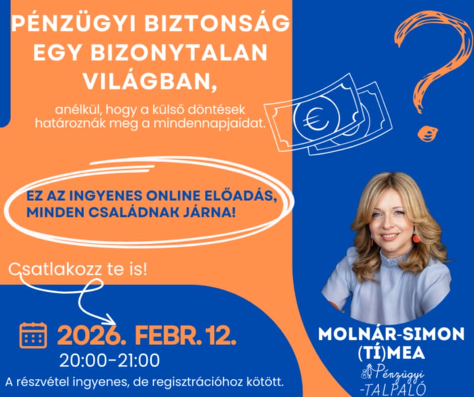 Foglald le a helyed a 2026. február 12-én 20:00 órakor kezdődő élő, teljesen INGYENES online előadásomra, és megmutatom, hogyan tudsz stabilitást teremteni a saját pénzügyeidben.